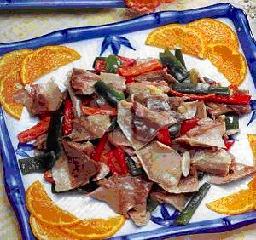 主料:白煮豬肚500克,青椒,紅椒各250克,蔥花,鹽,料酒,味精,花生油,水淀粉各適量。
