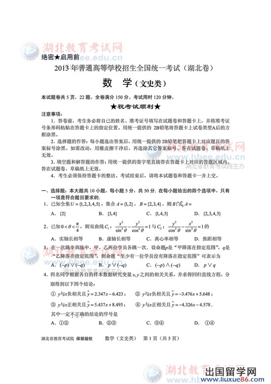 厚德載物,天道酬勤,相信自己,就一定能考出理想的成績。2013年高考正一分一秒的過去,出國留學(xué)網(wǎng)高考頻道小編全程關(guān)注2013年湖北高考事宜,2013年湖北高考數(shù)學(xué)考試將今天下午四點結(jié)束,小編將會第一時間內(nèi)公布2013年湖北高考數(shù)學(xué)真題及答案,請廣大考生及家長注意本頁更新,更多2013湖北高考科目真題及答案亦會在第一時間內(nèi)發(fā)布,高考真題及答案將在此表頁的頭條顯示,如果您需要查找的真題及答案沒有顯示,請按crtl+F5進(jìn)行刷新。歡迎收藏本網(wǎng)站(ctrl+D即可收藏)。