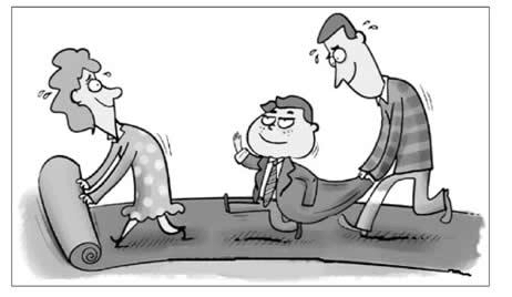 From the picture we can see a family of three walking on a long red carpet. The son , well dressed, waves proudly in the middle while the father behind bends forward to hold the jacket and the mother in front rolls out the carpet, sweating.