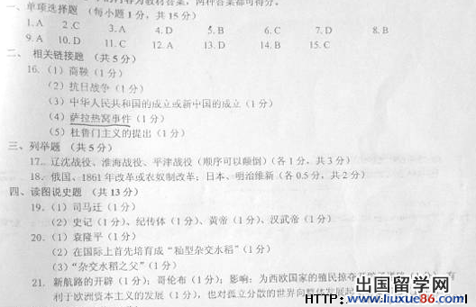 2013年中考英語考試已經(jīng)圓滿結(jié)束,2014年中考即將來臨,出國留學(xué)網(wǎng)(liuxue86.com)小編已為大家整理出遼寧錦州2013年中考?xì)v史答案(word版),幫助各位同學(xué)們對自己的英語成績進(jìn)行預(yù)估,敬請各位考生關(guān)注出國留學(xué)網(wǎng)(liuxue86.com)中考頻道其他科目的試題及答案的公布。