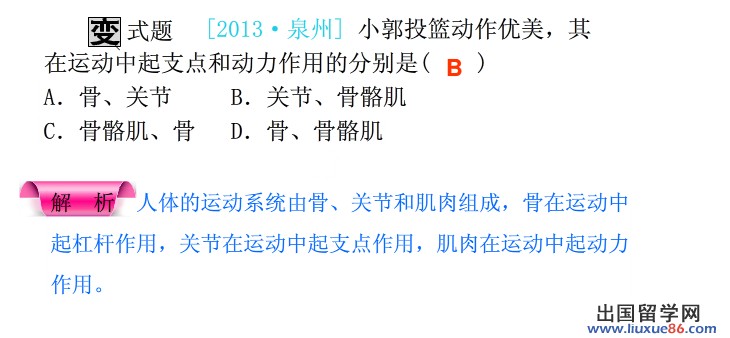 同學們復習《動物的運動和行為》時要注意重難點:1.通過觀察與思考,能說出人及哺乳動物運動系統(tǒng)的組成。2.通過自身體驗和制作模型,能解釋骨、關節(jié)和肌肉在運動中的配合。3.認同動物的運動依賴一定的結構。哺乳動物運動系統(tǒng)的組成和解釋骨、關節(jié)和肌肉在運動中的配合。更多有關2014中考生物的信息可登錄出國留學網(wǎng)生物頻道,歡迎收藏本站(CTRL+D即可收藏)!