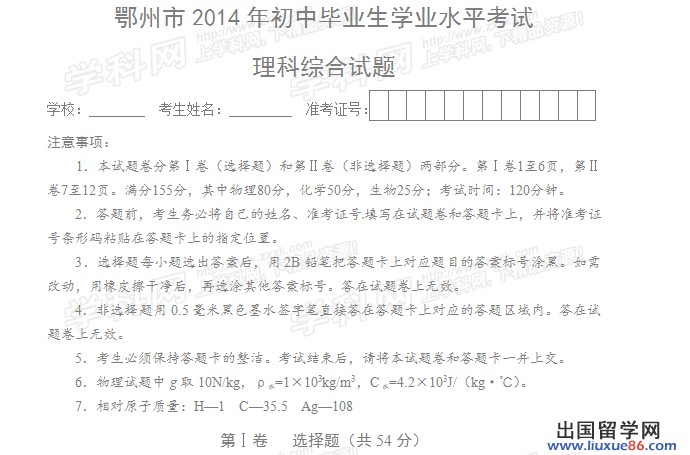 以下2014年鄂州中考理綜真題及答案由出國留學網(wǎng)中考頻道為您提供,希望對您有所幫助!
