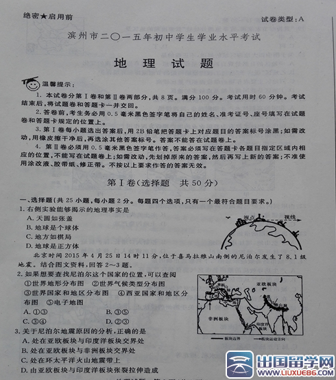 智者創(chuàng)造機(jī)會(huì),強(qiáng)者把握機(jī)會(huì),弱者等待機(jī)會(huì)。出國留學(xué)網(wǎng)中考頻道的小編會(huì)及時(shí)為廣大考生提供:2015年山東濱州市中考地理試題及答案,有需要的考生可以在考題公布后刷新本頁面(按ctrl+F5),希望對大家有所幫助。