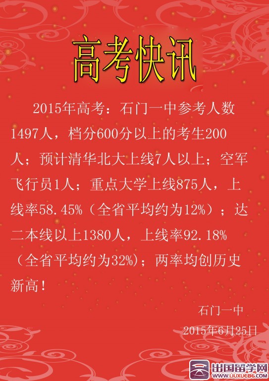 出國(guó)留學(xué)網(wǎng)高考成績(jī)頻道訊:2015年常德市石門一中高考成績(jī)