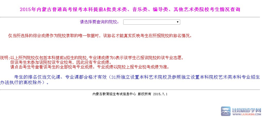 出國留學(xué)網(wǎng)高考頻道訊:2015年內(nèi)蒙古普通高考報考本科提前A批考生情況查詢?nèi)肟?BR> 2015年內(nèi)蒙古普通高考報考本科提前A批美術(shù)類、音樂類、編導(dǎo)類、其他藝術(shù)類院??忌闆r查詢