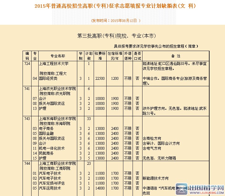 出國留學(xué)高考網(wǎng)為大家提供2015年上海高職(???征求志愿填報(bào)專業(yè)計(jì)劃缺額表(文),更多高考資訊請關(guān)注我們網(wǎng)站的更新!
