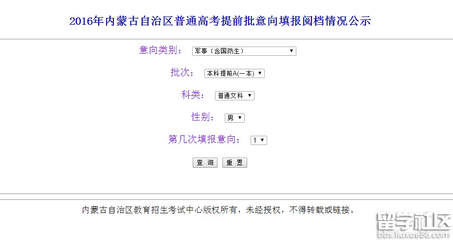 2016內(nèi)蒙古高考提前批意向填報(bào)閱檔情況:http://www1.nm.zsks.cn/xxcx/gkcx/yxtdqk.jsp