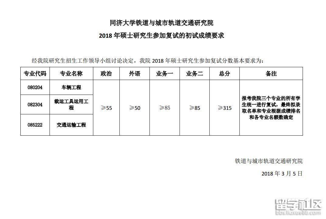同濟(jì)大學(xué)鐵道與城市軌道交通研究院2018考研復(fù)試分?jǐn)?shù)線
