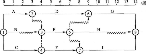 某工程雙代號時標網(wǎng)絡(luò)計劃如下圖所示,如果B、D、I三項工作共用一臺施工機械且必須按順序施工,則( )。