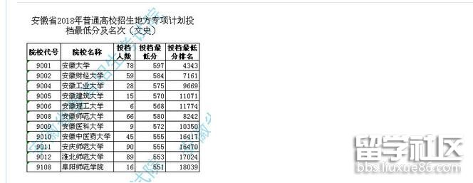 安徽2018年普通高校招生地方專項(xiàng)計(jì)劃投檔最低分及名次(文史)