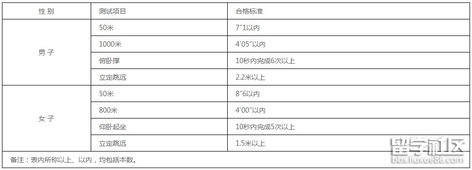 第十八條 體能條件。報(bào)考山東警察學(xué)院的考生,須參加體能測(cè)試,且成績(jī)合格。測(cè)試項(xiàng)目和合格標(biāo)準(zhǔn)見(jiàn)下表: