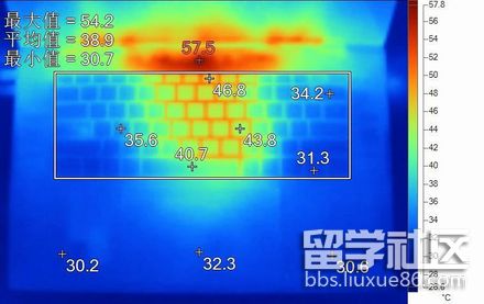 表面溫度如上圖所示,鍵盤鍵帽溫度最高為46.8℃,WASD鍵位區(qū)域在35℃附近,方向鍵31.3℃。左腕托溫度為30.2℃。