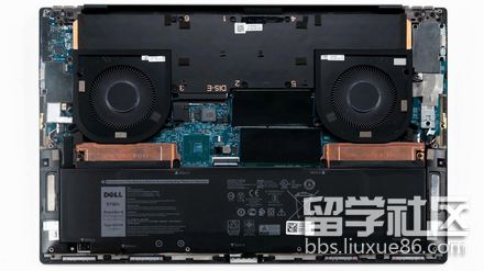 上圖是戴爾 XPS17 9700的拆機實拍圖,雙風扇+大面積均熱板的組合,這個內(nèi)部設(shè)計水平已是Windows陣營中的頂級。