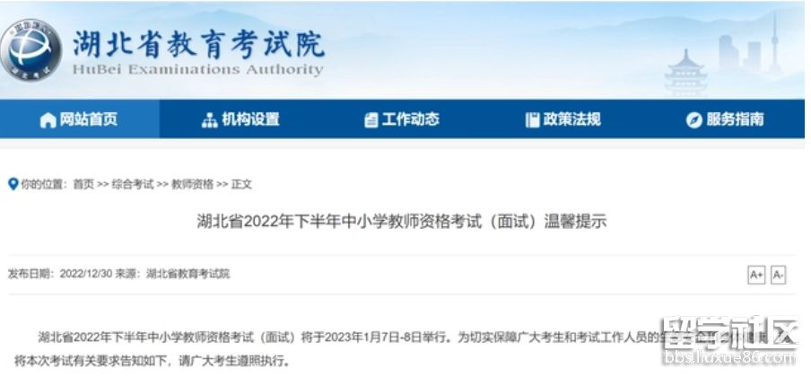 湖北省2022年下半年中小學(xué)教師資格考試(面試)將于2023年1月7日-8日舉行。為切實(shí)保障廣大考生和考試工作人員的生命安全和身體健康,現(xiàn)將本次考試有關(guān)要求告知如下,請(qǐng)廣大考生遵照?qǐng)?zhí)行。