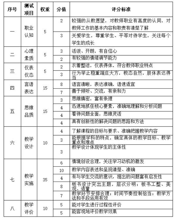面試遵循教育部《中小學(xué)教師資格考試標(biāo)準(zhǔn)》和《考試大綱》(面試部分),主要考核申請人職業(yè)道德、心理素質(zhì)、儀表儀態(tài)、言語表達(dá)、思維品質(zhì)等教學(xué)基本素養(yǎng)和教學(xué)設(shè)計(jì)、教學(xué)實(shí)施、教學(xué)評價(jià)等教學(xué)基本技能。