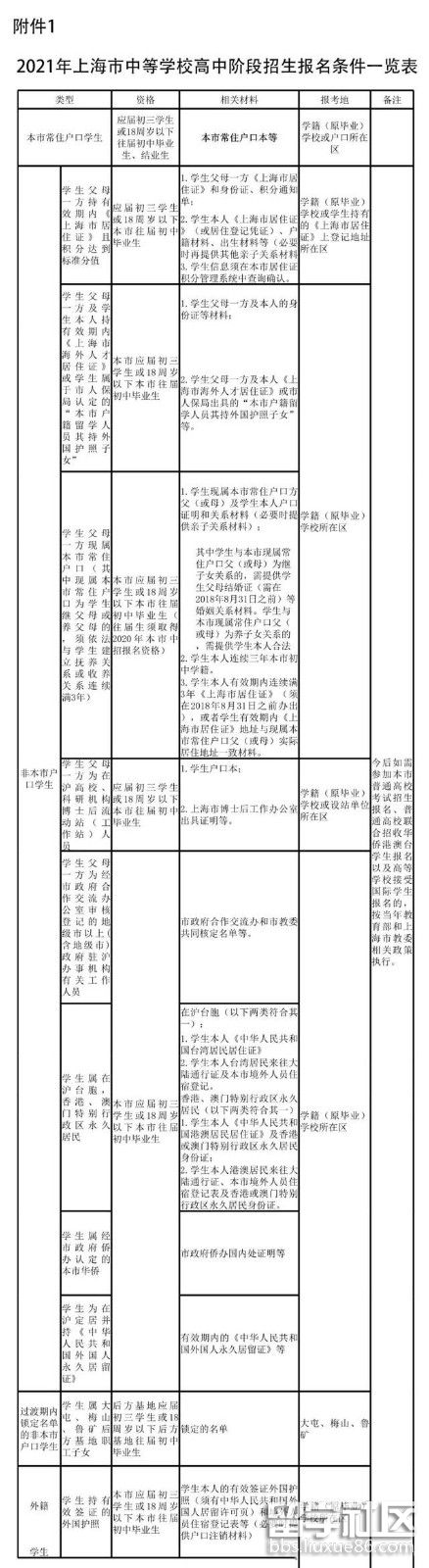學(xué)生父母一方持有效期內(nèi)的《上海市居住證》且積分達(dá)到標(biāo)準(zhǔn)分值學(xué)生父母一方及學(xué)生本人持有效期內(nèi)《上海市海外人才居住證》或?qū)W生屬于市人保局認(rèn)定的“本市戶籍留學(xué)人員其持外國(guó)護(hù)照子女”學(xué)生父母一方現(xiàn)屬本市常住戶口(其中現(xiàn)屬本市常住戶口為學(xué)生繼父母或養(yǎng)父母的,須依法與學(xué)生建立撫養(yǎng)關(guān)系或收養(yǎng)關(guān)系連續(xù)滿3年)學(xué)生父母一方為在滬高校、科研機(jī)構(gòu)博士后流動(dòng)站(工作站)人員學(xué)生父母一方為經(jīng)市政府合作交流辦公室審核登記的地級(jí)市以上(含地級(jí)市)政府駐滬辦事機(jī)構(gòu)有關(guān)工作人員學(xué)生屬在滬臺(tái)胞,香港、澳門特別行政區(qū)永久居民學(xué)生屬經(jīng)市政府僑辦認(rèn)定的本市華僑學(xué)生為在滬定居并持《中華人民共和國(guó)外國(guó)人永久居留證》。