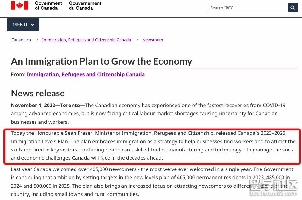 11月1日,IRCC部長Sean Fraser公布了加拿大2023-2025年移民水平計(jì)劃(Immigration Levels Plan),揭示了未來3年全新的移民配額。