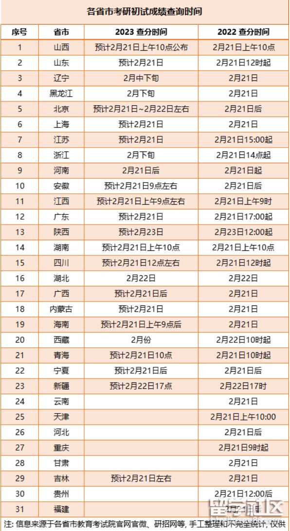 目前已有6個(gè)省市透露2023考研初試成績(jī)查詢時(shí)間,多為2月中下旬、2月21日左右,其中湖北省已發(fā)布正式通知確定成績(jī)公布時(shí)間為2月22日,與2022年考研初試查分時(shí)間一致。因此,今年初試成績(jī)查詢時(shí)間大概率在2月21日左右,小概率會(huì)提前公布。