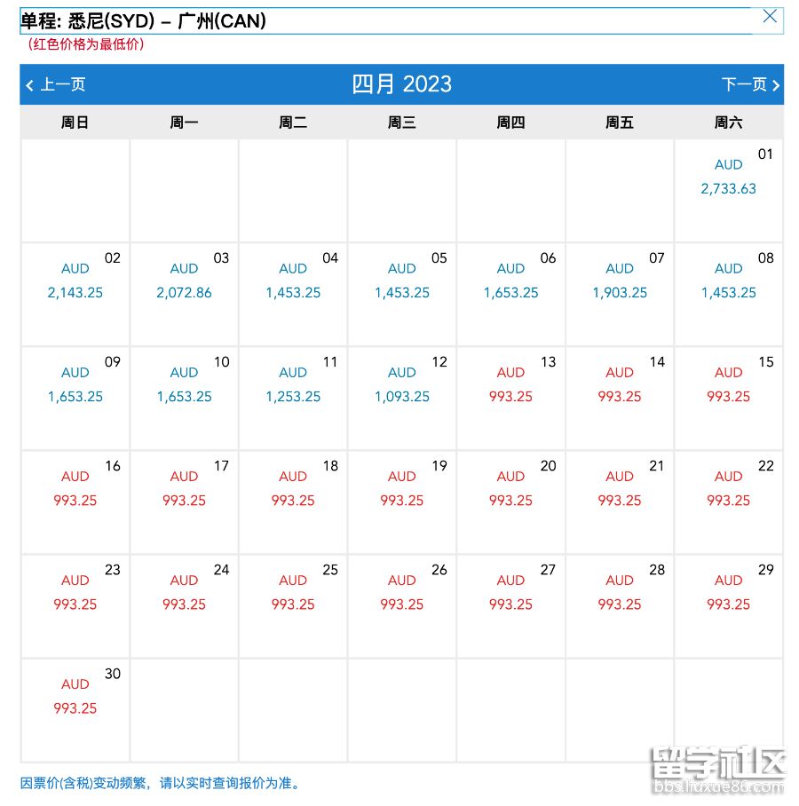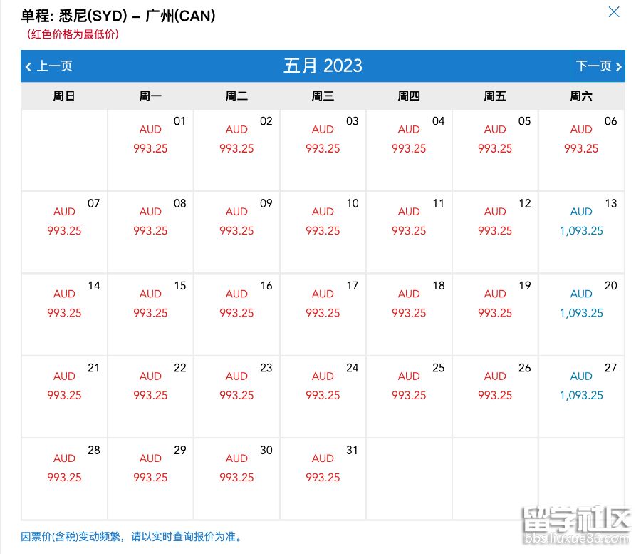 悉尼-廣州最低993澳幣