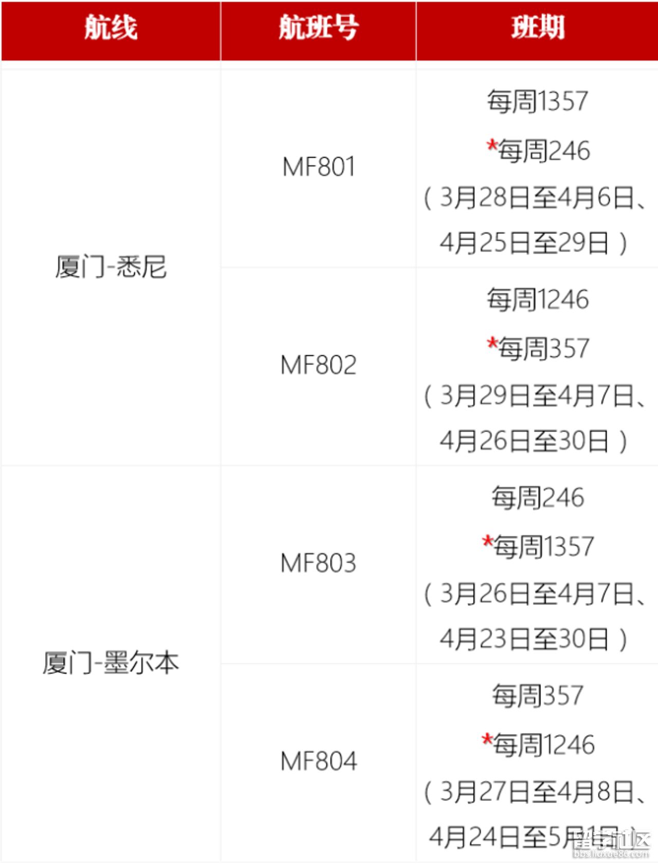 廈門航空澳洲航線,廈門往返悉尼每周四班,廈門往返墨爾本每周三班。