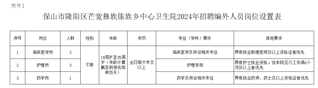 本次招聘編外人員6名,其中:臨床醫(yī)學(xué)崗:2人;護(hù)理崗:3人;藥學(xué)崗:1人;詳見附件1:《保山市隆陽(yáng)區(qū)芒寬彝族傣族鄉(xiāng)中心衛(wèi)生院2024年招聘編外人員崗位設(shè)置表》。