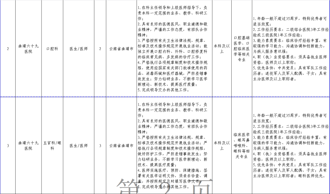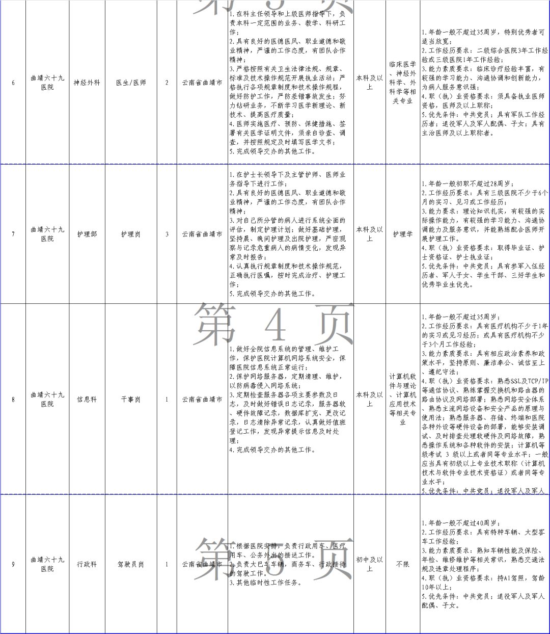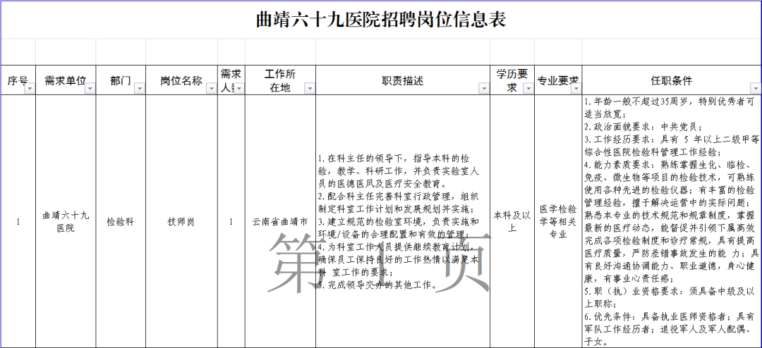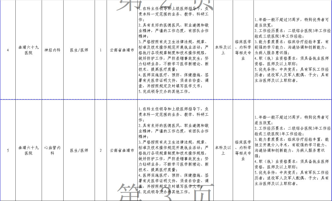 具體崗位及任職條件詳見(jiàn)《曲靖六十九醫(yī)院招聘崗位信息表》(附件1)