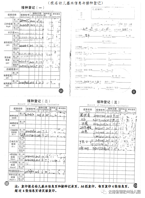三、報(bào)名幼兒《云南省兒童預(yù)防接種證》基本信息與接種登記頁(yè)雙面復(fù)印在一張A4紙上。