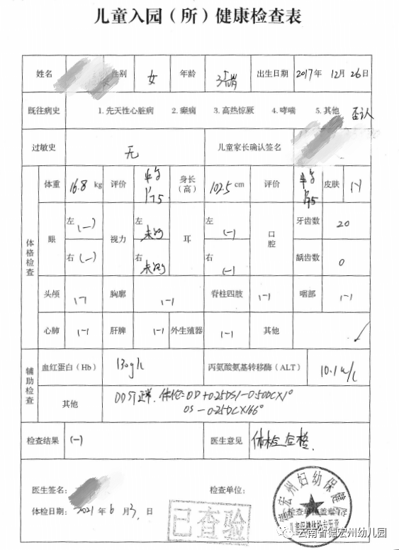 (六)辦理相關(guān)手續(xù):6月17日,擬招幼兒家長(zhǎng)根據(jù)德宏州幼兒園電話通知,攜帶幼兒體檢合格單(含肝功化驗(yàn)單)原件帶領(lǐng)幼兒到園辦理相關(guān)手續(xù)(新生訪談、繳費(fèi)、簽訂承諾書(shū)等)。