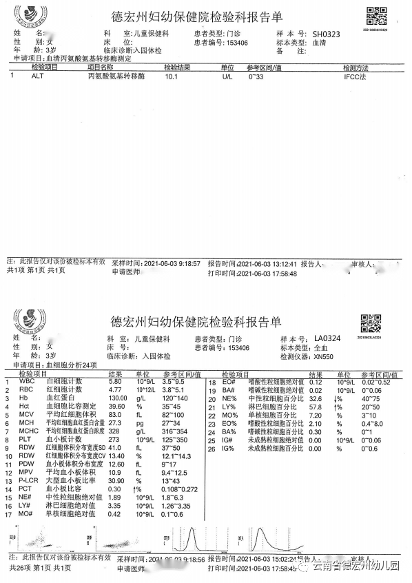 (4)2023年5月28日~2023年6月3日幼兒體檢合格單(含肝功化驗(yàn)單)。