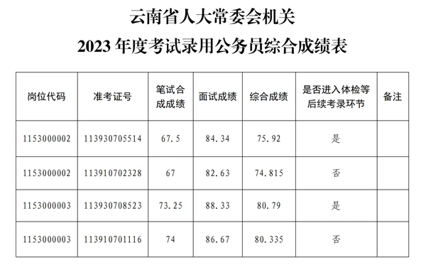 根據(jù)云南省2023年度考試錄用公務(wù)員工作安排,筆試、面試工作已經(jīng)結(jié)束,現(xiàn)將報(bào)考云南省人大常委會(huì)機(jī)關(guān)公務(wù)員考生綜合成績及后續(xù)工作安排公告如下。