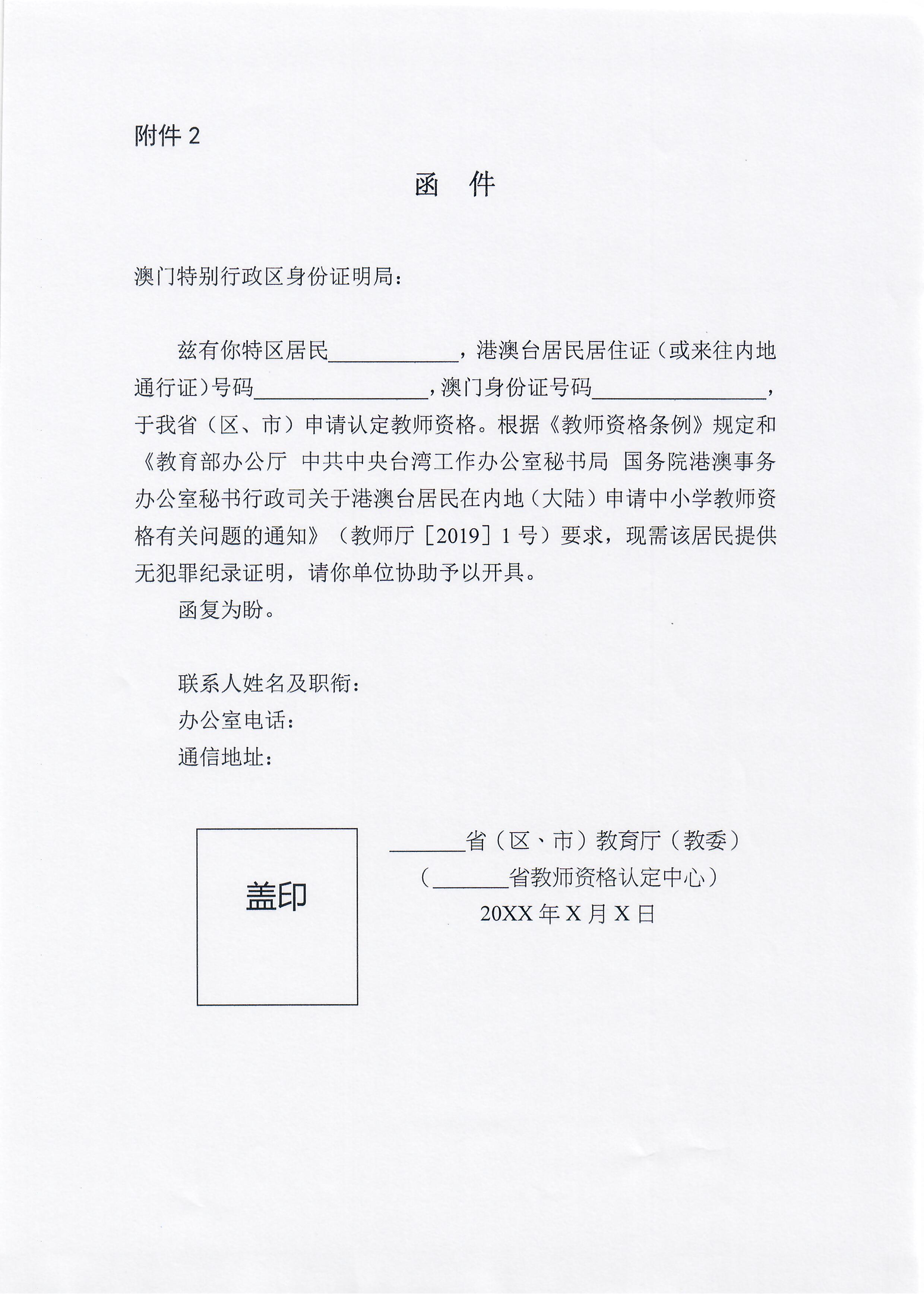 (2)港澳臺居民申請認(rèn)定中小學(xué)教師資格需提供無犯罪記錄證明。無犯罪記錄證明由申請人自行到香港特別行政區(qū)、澳門特別行政區(qū)和臺灣地區(qū)的有關(guān)部門開具。香港特別行政區(qū)、澳門特別行政區(qū)申請人開具無犯罪記錄證明所需的《無犯罪記錄證明函件》(附件1、2),由申請人填寫后交給現(xiàn)場確認(rèn)點(diǎn),待省級機(jī)構(gòu)填寫蓋章完畢后,通知申請人到認(rèn)定機(jī)構(gòu)領(lǐng)取,再由申請人自行攜帶函件到香港或澳門的警務(wù)部門辦理無犯罪證明,港澳警務(wù)部門核實(shí)后,將核查結(jié)果反饋給出具函件的省級機(jī)構(gòu),省級機(jī)構(gòu)再將核查結(jié)果通知有關(guān)教育局作為認(rèn)定依據(jù),具體的辦理程序請咨詢港澳警務(wù)部門。臺灣地區(qū)的申請人的無犯罪證明,由申請人自行到臺灣地區(qū)相關(guān)部門開具,開好的無犯罪證明直接交給申請認(rèn)定的認(rèn)定機(jī)構(gòu)。