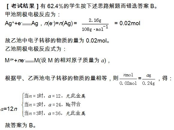 [試題] 甲、乙兩個(gè)電解池均以Pt為電極,且互相串聯(lián),甲池盛有AgNO3溶液,乙池盛有一定量的某鹽溶液。通電一段時(shí)間后,測(cè)得甲池中陰極質(zhì)量增加2.16g,乙池中電極上析出0.24g金屬,則乙池中溶質(zhì)可能是( ?。?BR> A.CuSO4 B.Mg(NO3)2 C.Al(NO3)3 D.Na2SO4