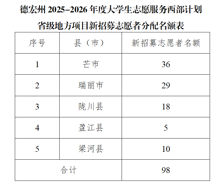 本年度德宏州擬新招募大學(xué)生西部計(jì)劃省級(jí)地方項(xiàng)目志愿者98名,具體請(qǐng)見名額分配表。