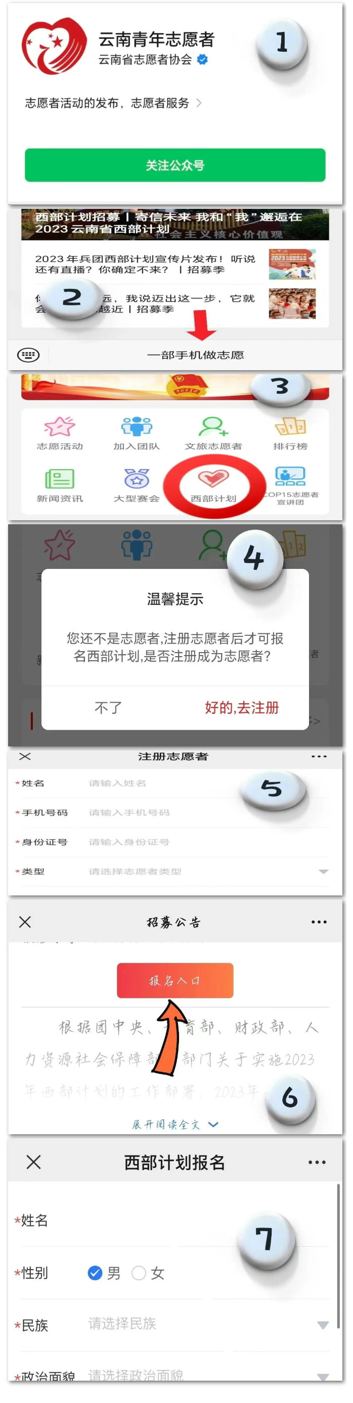 1.提交報(bào)名申請(qǐng)。本次招募采取網(wǎng)上報(bào)名。即日起至6月10日,報(bào)名人員關(guān)注微信公眾號(hào)“云南青年志愿者”,點(diǎn)擊“一部手機(jī)做志愿”——“西部計(jì)劃”——“注冊(cè)志愿者”——“報(bào)名入口”填寫個(gè)人相關(guān)信息資料,填寫報(bào)名表并選擇意向服務(wù)縣,提交報(bào)名申請(qǐng)。報(bào)名時(shí)在網(wǎng)上所提交的申請(qǐng)材料必須真實(shí)、準(zhǔn)確,因網(wǎng)上報(bào)名提交的申請(qǐng)材料不真實(shí)、不完整或者錯(cuò)誤填寫報(bào)名信息,而造成網(wǎng)上資格審查、面試資格審查、考察不通過等后果,由報(bào)名人員自行承擔(dān)責(zé)任。