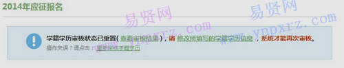 情況二:學(xué)籍學(xué)歷核驗(yàn)通過(guò),同時(shí)兵員預(yù)征尚未開始或用戶被標(biāo)記為“非預(yù)征對(duì)象”,則在應(yīng)征信息修改頁(yè)面的個(gè)人信息后面,或者在“校驗(yàn)結(jié)果(首頁(yè)中有該鏈接)”頁(yè)面,會(huì)有“提示:如果學(xué)籍學(xué)歷信息與學(xué)信檔案不符,您可以 “修改學(xué)籍學(xué)歷信息”,點(diǎn)擊該鏈接,可以重置您的學(xué)籍學(xué)歷核驗(yàn)狀態(tài),此時(shí),可以在應(yīng)征信息修改頁(yè)面修改您的學(xué)籍學(xué)歷信息,修改完畢,系統(tǒng)會(huì)重新審核您的學(xué)籍學(xué)歷信息。該功能24小時(shí)之內(nèi)只能使用兩次,總計(jì)使用不能超過(guò)10次,請(qǐng)慎重使用。