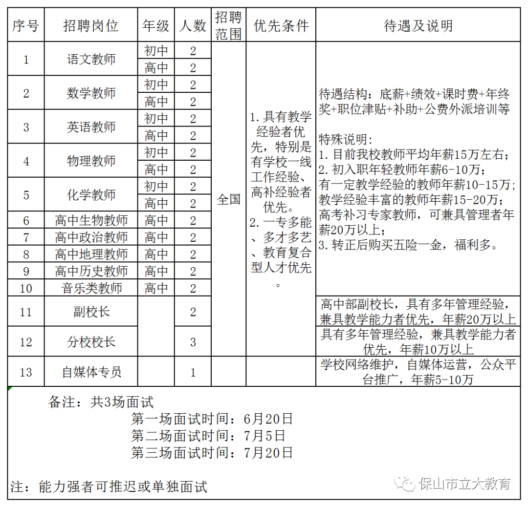 保山市立大高補學(xué)校主要以高考補習(xí)班、藝考班、初高三全日制沖刺班為主、周末假期班為輔,涉及學(xué)生群體主要面臨中高考,對招聘教師要求較為嚴格,薪水待遇高于行業(yè)平均水平,福利較多,轉(zhuǎn)正后將購買五險一金。