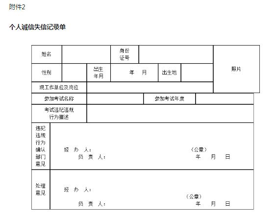 建立失信應(yīng)試人員黑名單制度,加大失信聯(lián)合懲戒力度,加強跨部門聯(lián)動響應(yīng)。失信行為記入專業(yè)技術(shù)人員資格考試誠信檔案庫,誠信檔案庫的失信應(yīng)試人員納入全國信用信息共享平臺,完善“一處失信、處處受限”的聯(lián)合懲戒機制。失信應(yīng)試人員信息將視情況向社會公布或通報,并通知當事人所在單位,《個人誠信失信記錄單》(附件2)放入個人檔案,涉嫌犯罪的,移送司法機關(guān)處理。