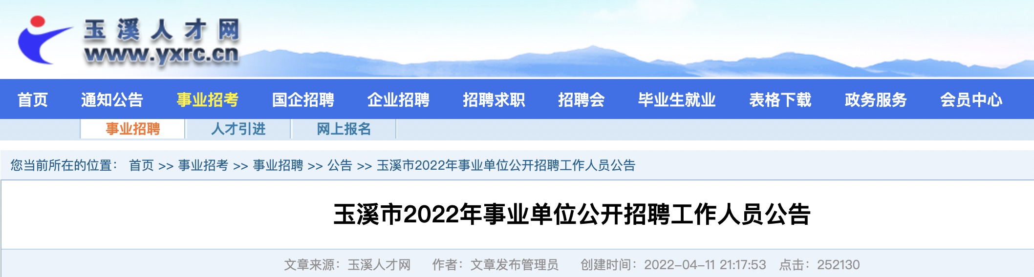 2022年云南玉溪市事業(yè)單位事業(yè)編制工作人員招聘公告【841人】已發(fā)布,網(wǎng)絡(luò)報名時間為:2022年4月18日上午8∶00至4月20日23∶00,現(xiàn)將招聘公告原文發(fā)布如下: