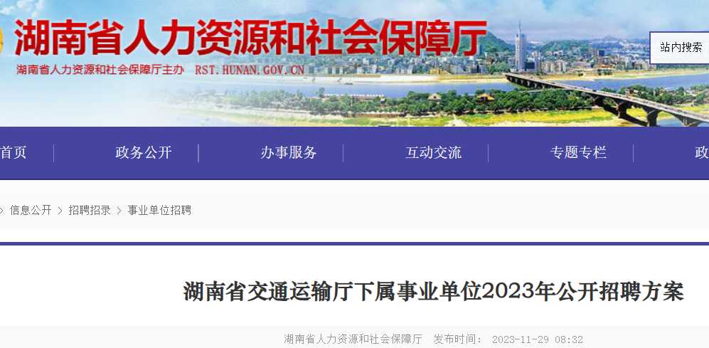 招聘信息通過湖南省人力資源和社會保障廳(http://rst.hunan.gov.cn/)、湖南省交通運輸廳、湖南省水運事務中心網(wǎng)站公開發(fā)布。