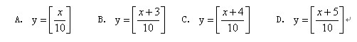 10.某學(xué)校要召開學(xué)生代表大會(huì),規(guī)定各班每10人推選一名代表,當(dāng)各班人數(shù)除以10的余數(shù)大于6時(shí)再增選一名代表,那么,各班可推選代表人數(shù)y與該班人數(shù)x之間的函數(shù)關(guān)系用取整函數(shù)y=[x]( [x]表示不大于x的大整數(shù))可以表示為 【B】