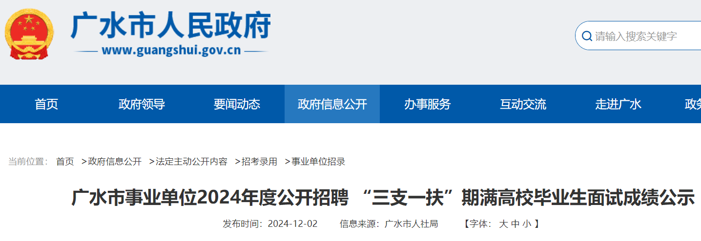 廣水市事業(yè)單位2024年度公開招聘“三支一扶”期滿高校畢業(yè)生于2024年11月30日統(tǒng)一組織公開招聘面試,現(xiàn)將面試成績予以公示。面試成績最低合格分?jǐn)?shù)線為75分。低于最低合格分?jǐn)?shù)線的考生,不能進(jìn)入下一招聘環(huán)節(jié)。