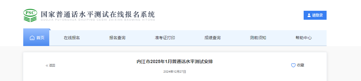 特別說(shuō)明:本次報(bào)名不在網(wǎng)站報(bào)名,報(bào)名方式更改為用微信掃碼填表、繳費(fèi),繳費(fèi)成功即報(bào)名成功,且所填信息必須準(zhǔn)確無(wú)誤,否則影響后續(xù)測(cè)試。具體報(bào)名方式及流程請(qǐng)仔細(xì)閱讀“內(nèi)江普通話培訓(xùn)測(cè)試”微信公眾號(hào)即將于2025年1月1日發(fā)布的公告。