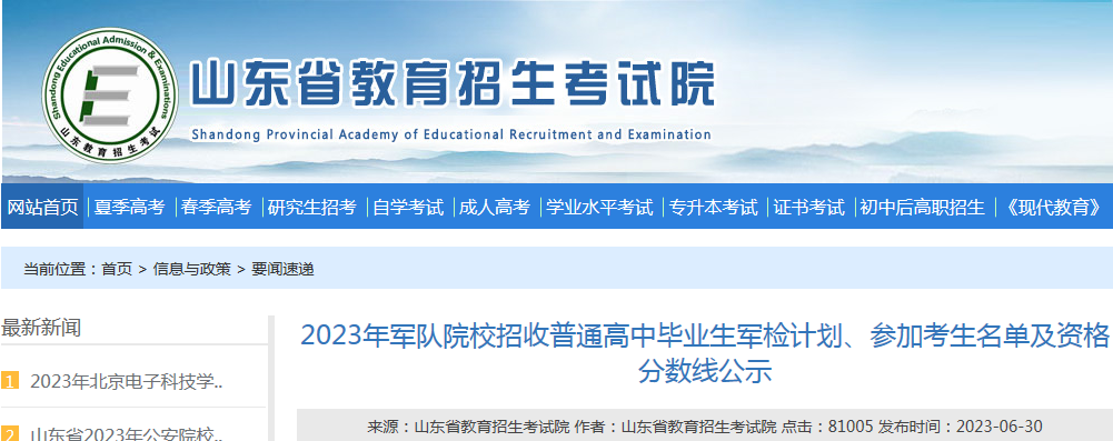 高考頻道從山東省教育招生考試院了解到,2023年山東軍隊(duì)院校招收普通高中畢業(yè)生軍檢計(jì)劃、參加考生名單及資格分?jǐn)?shù)線公示。詳情如下:
