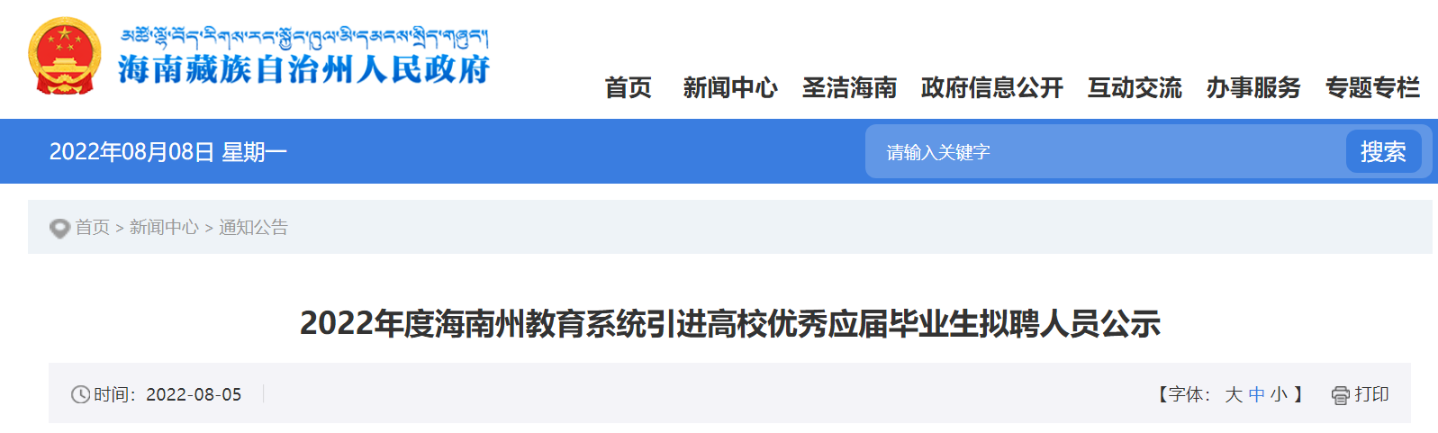 2022年度青海海南州教育系統(tǒng)引進(jìn)高校優(yōu)秀應(yīng)屆畢業(yè)生擬聘人員公示已發(fā)布,公示期為2022年8月6日至2022年8月12日。現(xiàn)將原文發(fā)布如下: