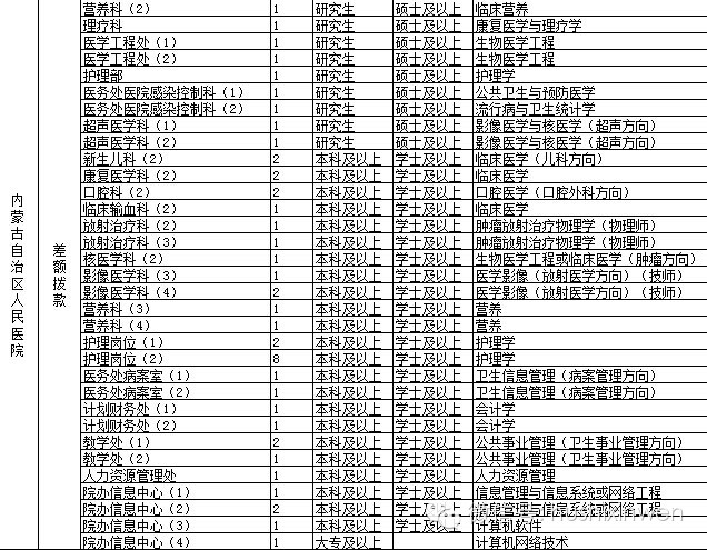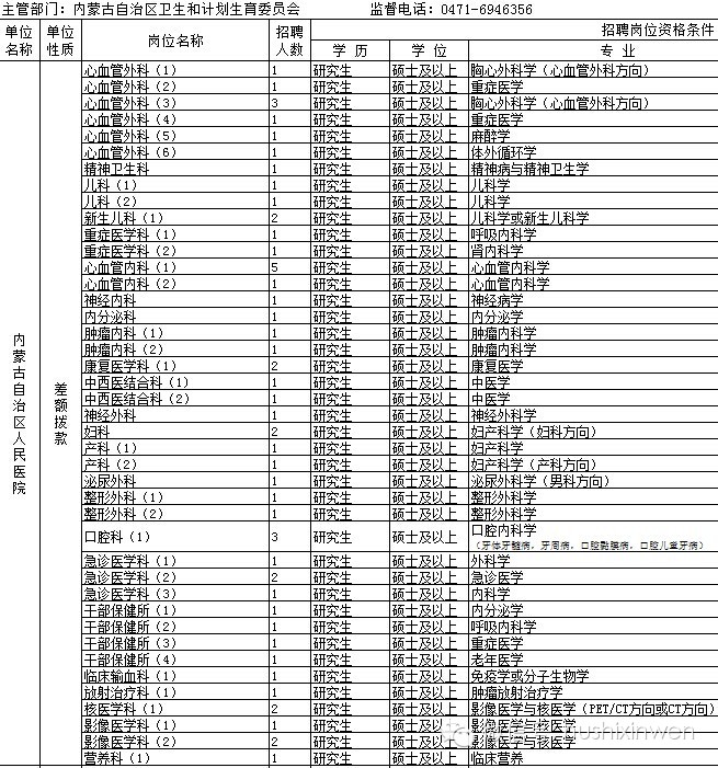 2.招聘中涉及的有關(guān)學(xué)歷、學(xué)位、專業(yè)等資格條件方面的問(wèn)題,由負(fù)責(zé)資格審查的內(nèi)蒙古自治區(qū)人民醫(yī)院解釋。具體咨詢電話詳見《崗位需求表》。