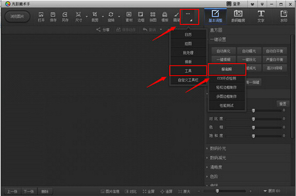 4、點擊軟件工具欄上最右側(cè)的【工具】按鈕,選擇【報名照】。如最右側(cè)不是【工具】按鈕,可點擊“畫筆”按鈕右側(cè)的【…】按鈕,再選擇【工具】按鈕,選擇【報名照】。