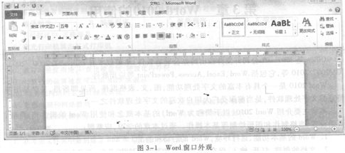 Word窗口由標題欄、快速訪問工具欄、文件選項卡、功能區(qū)、工作區(qū)、狀態(tài)欄、文檔視圖工具欄、顯示比例控制欄、滾動條、標尺等部分組成。在Word窗口的工作區(qū)中可以對創(chuàng)建或打開的文檔進行各種編輯、排版操作。Word窗口組成如圖3-2所示。