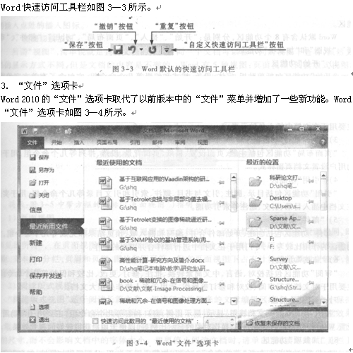 Word默認的快速訪問工具欄包含保存、撤銷、重復和自定義快速訪問工具欄命令按鈕,Word快速訪問工具欄如圖3—3所示。
