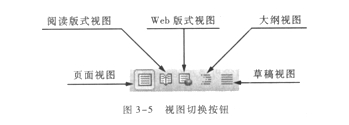 所謂“視圖”,簡單說就是查看文檔的方式。同一個文檔可以在不同的視圖下查看,雖然文檔的顯示方式不同,但是文檔的內(nèi)容是不變的。Word有5種視圖:頁面視圖、閱讀版式視圖、Web版式視圖、大綱視圖和草稿視圖,用戶可以根據(jù)對文檔的操作需求不同使用不同的視圖。視圖之間的切換可以使用“視圖”功能區(qū)中的命令,但更簡潔的方法是使用水平滾動條左端的視圖切換按鈿,如圖3—5所示。