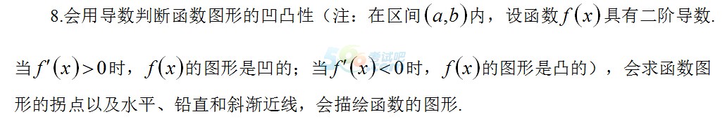 導數(shù)和微分的概念、 導數(shù)的幾何意義和物理意義、 函數(shù)的可導性與連續(xù)性之間的關 系、 平面曲線的切線和法線、 導數(shù)和微分的四則運算、 基本初等函數(shù)的導數(shù)、 復合函數(shù)、 反函數(shù)、隱函數(shù)以及參數(shù)方程所確定的函數(shù)的微分法、 高階導數(shù)、 一階微分形式的不變 性、 微分中值定理 洛必達(L'Hospital)法則、 函數(shù)單調性的判別、 函數(shù)的極值、 函數(shù)圖 形的凹凸性、拐點及漸近線、 函數(shù)圖形的描繪、 函數(shù)的值與最小值、 弧微分、 曲率的 概念 、曲率圓與曲率半徑